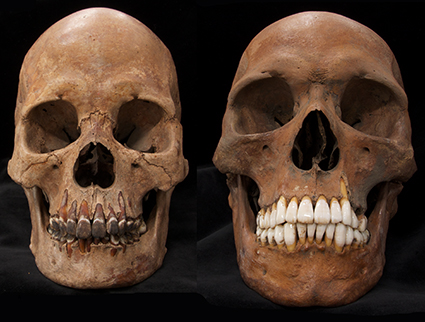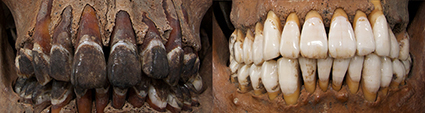 If you look at the detailed photographs of the blackened Edo incisor teeth, you can see that the part of the tooth crown closest to the alveolar bone, is not blackened. During life, this part of the tooth is covered by the oral soft tissues (gingiva), which would have prevented the dye from coming in contact with this part of the tooth. It is a clear indication that the teeth of this young woman had been stained during life, or at least before burial. Both sex and age can be determined by her skeleton, and the history of Ohaguro suggests that she was a married woman. She had died after recently dying her teeth (2-3 days), or her teeth had been dyed as part of the funeral preparations.