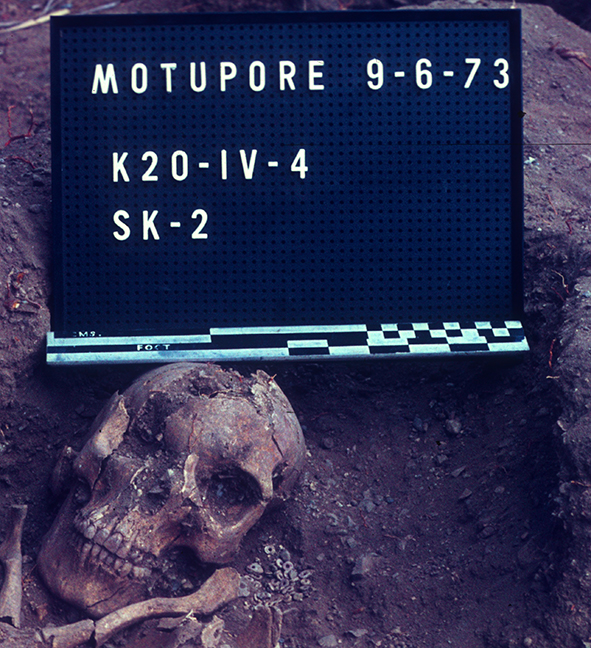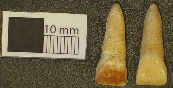 The areca nut is the seed of the areca palm (Areca catechu) and is often chewed wrapped in betel leaves. Betel is the leaf of a vine (Piper betle) belonging to the Piperaceae family, which includes pepper and kava. It is valued as a mild stimulant and is sometimes also chewed with a mixture of lime, tocbacco and spices (paan). During chewing a red stain is generated by the combination of ingredients. This can stain the teeth, lips and oral mucosa, with the archaeological evidence of stained teeth persisting for as long as 1000 years in parts of southeast Asia. Excavations of a cemetary on Motupore Island, Bootless Bay, Papua, in the 1970's (Allen et al., 1997), dating to around 400-500 BP, found many examples of betel stained teeth (I was responsible for cleaning and reconstructing the human skeletons in 1978-79). In the central incisor tooth (below) staining was present on the front (labial) surface of the crown but not on the rear of the tooth. The burial (below) contained large numbers of shell beads that were manufactured by the Motu residents of Motupore Island (Allen et al., 1997), and also had betel stains on incisor teeth. In contrast to ohaguru, both men and women chewed betel leaves, so betel staining is not an indication of a male or female burial.